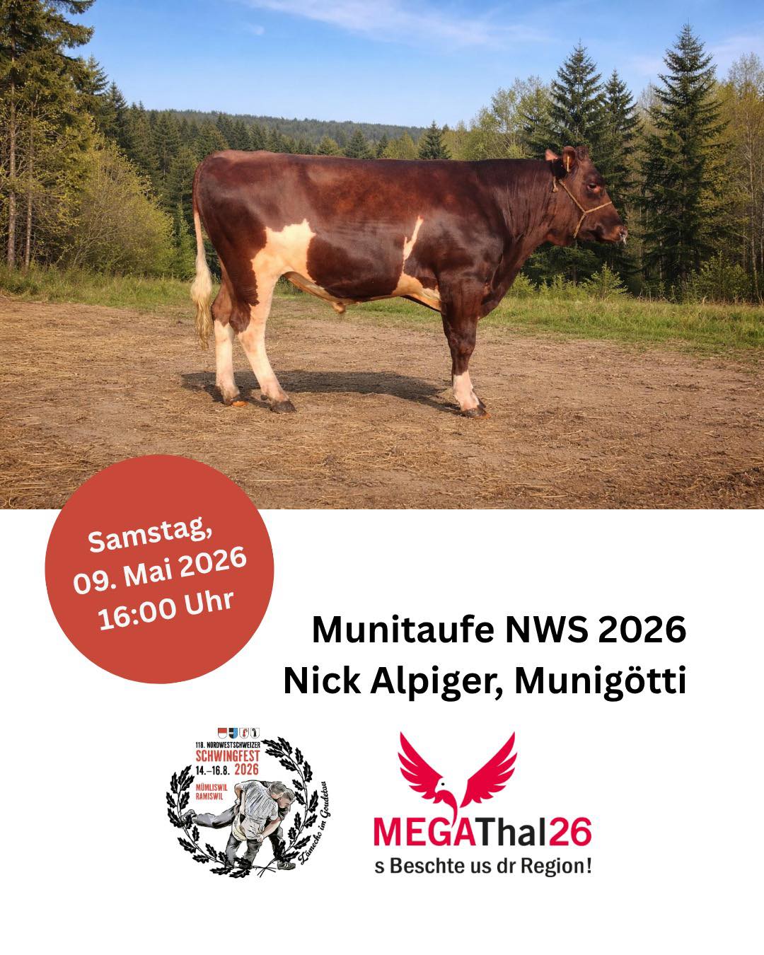 Am Samstag, 9.5.2026 um 16.00 Uhr findet auf dem Reitplatz Moos in Balsthal die Munitaufe mit Spitzenschwinger und Götti Nick Alpiger statt. Besuche uns am Stand 4.08 und kaufe…